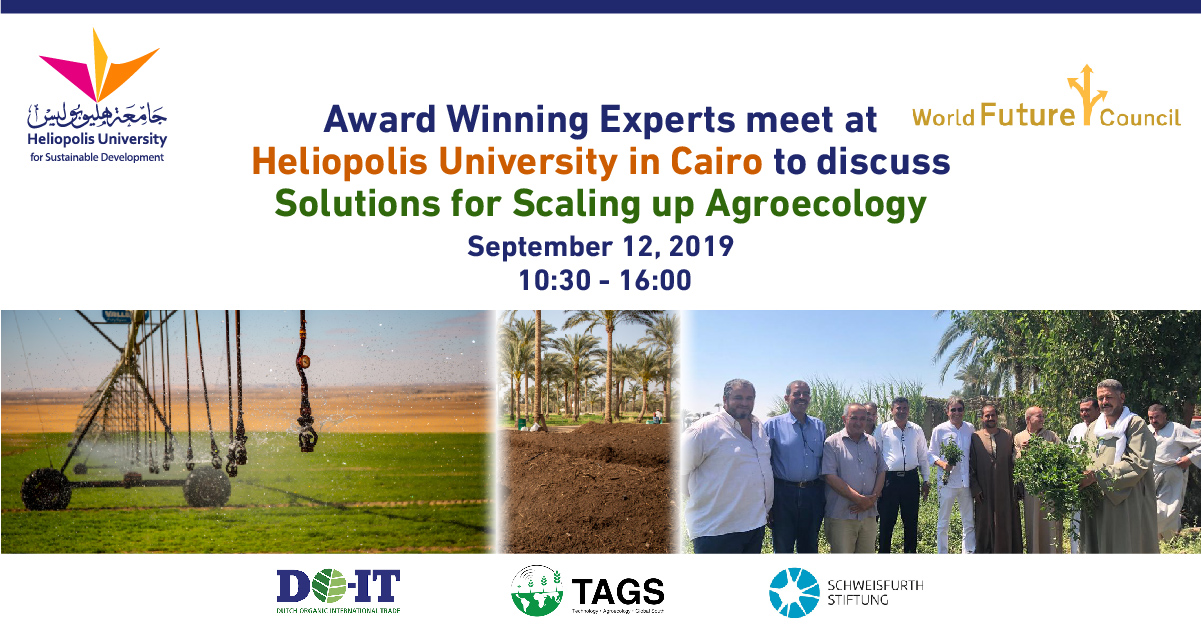 يجتمع تحت رعاية مجلس مستقبل العالم وجامعة هليوبوليس يوم الخميس القادم متحدثين حائزين على جوائز عالمية وصناع للقرار وخبراء دوليين سيعرضون حلولاً فعالة لتوسيع نطاق الايكولوجيا الزراعية في إفريقيا وخارجها. هذه الحلول تعزز المساحات الخصبة وتعمل على تحسين الدخل للمزارعين. سيتم كذلك عرض السياسات الفائزة بجائزة سياسات المستقبل لعام ٢٠١٨ من بلاد الهند والإكوادور والسنغال.