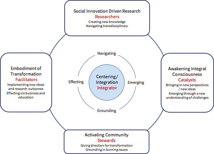Diese letzte Rolle des Integrierers ist entscheidend für den gesamten sozialen Innovationsprozess. Seine Aufgabe ist es, die Besetzung für die Rollen Steuermann/frau, Katalysator, Forscher und Umsetzer zu finden. Er führt die Fäden des gesamten Innovationsökosystems zusammen und wird auch für jedes einzelne Visionsziel gebraucht.