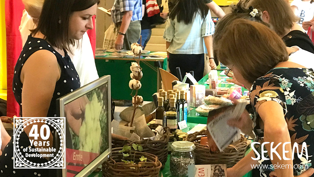 On June 30, a huge event on the sister cities took place in Stuttgart. Taken for granted, the German SEKEM Friends participated the event and represented their commitment in and for Egypt in many different ways. Among several other projects from Tunisia, India or Poland, the SEKEM Friends displayed comprehensive information on the subject of cotton processing in Egypt. SEKEM does not only cultivate cotton under biodynamic guidelines, but also guarantees further processing and production within the country, for the most part even within the SEKEM companies themselves. Of particular interest among the visitors was the cottonseeds and small plants that have been distributed by the SEKEM Friends as presents to the guests. Also, handicraft offered for children with cotton yarns were well received. And a few revenues for the association were generated by selling SEKEM products via the new SEKEM Online Shop. The SEKEM Friends had been especially happy about the great offer of help from several people. In addition to members of the board and advisory boards, support came from long-term and new friends.