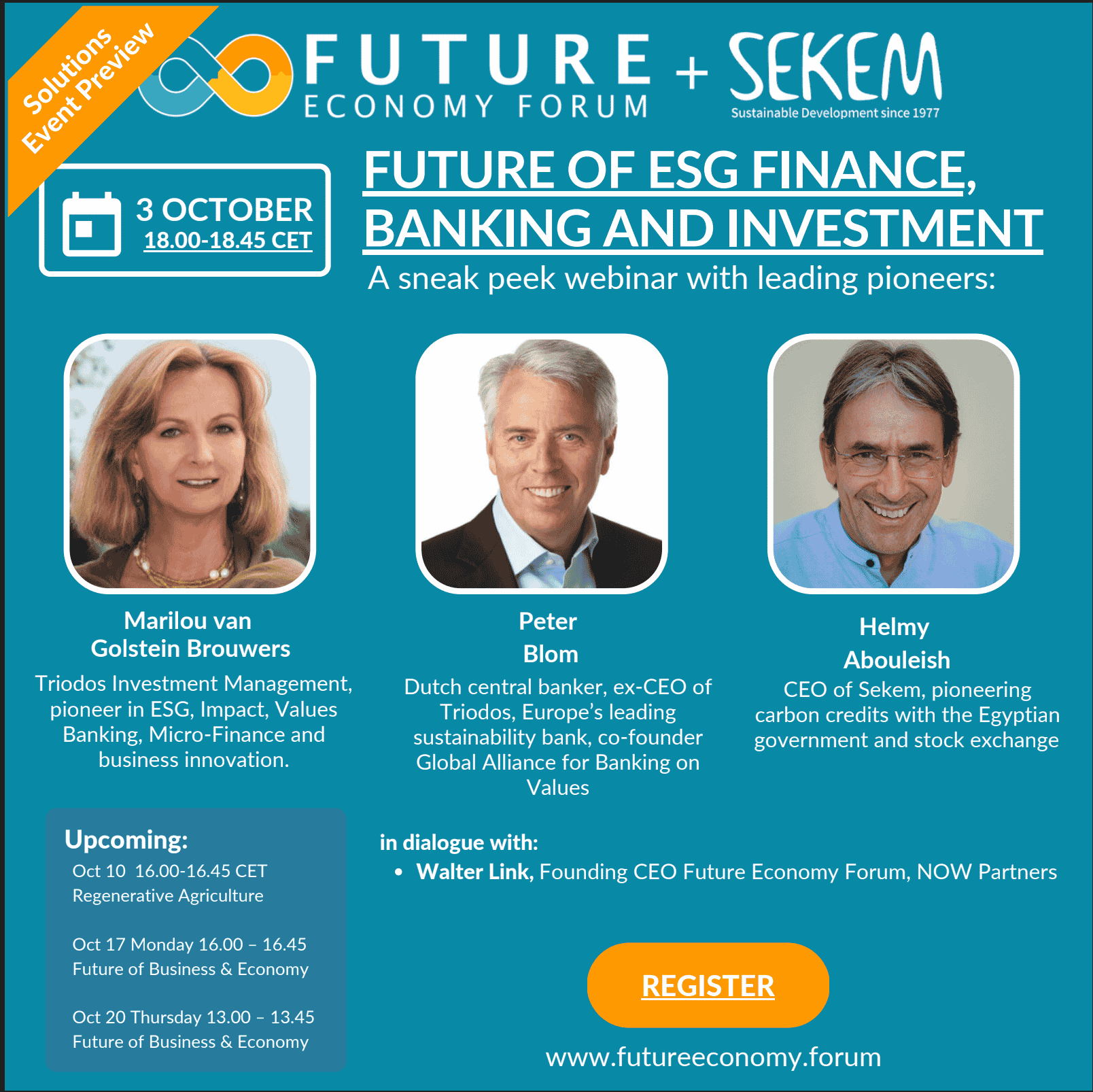 - Peter Blom – Dutch central banker, ex-CEO of Triodos, Europe’s leading sustainability bank, co-founder of Global Alliance for Banking on Values of ESG banks in 44 countries.